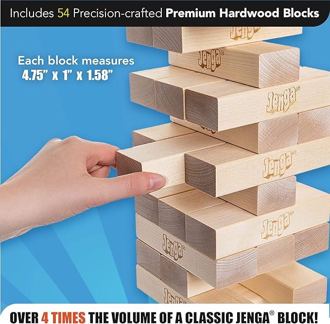 Complete Giant Stacking Tower Set: Enjoy 54 precision crafted premium hardwood 4.75" X 1" X 1.58" blocks, ideal for indoor and outdoor family fun, the game starts at 18in and can grow over 3ft tall during play.