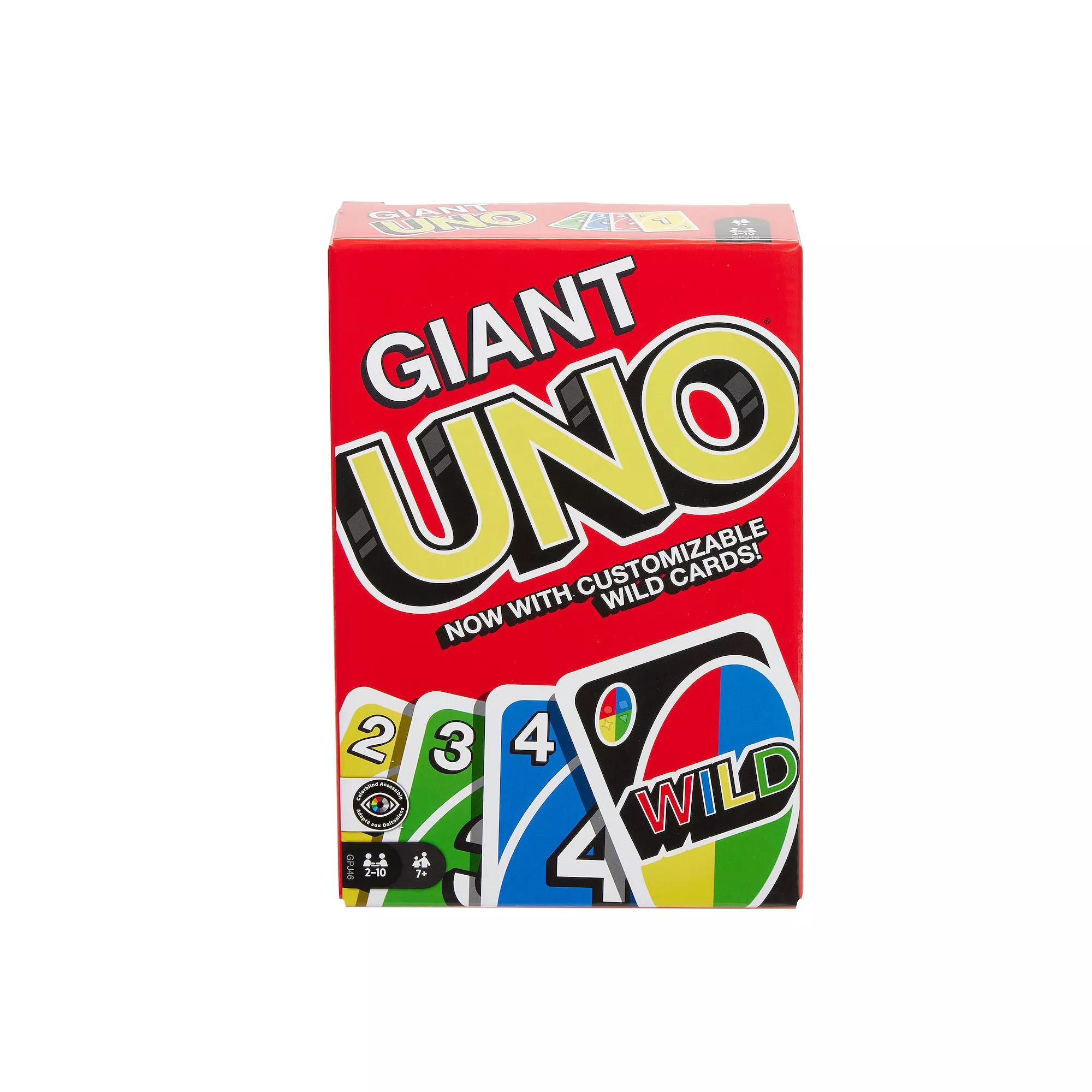 It's the matching card game you know, now at three times as large! Players still race to get rid of all their cards by matching a card in their hand with the top card on the discard pile. When you're down to one card, don't forget to yell "UNO!" in a giant way. It's the matching card game you know, now at three times as large! Players still race to get rid of all their cards by matching a card in their hand with the top card on the discard pile. When you're down to one card, don't forget to yell "UNO!" in a giant way. Just like in classic UNO, match cards by color or number in a race to deplete your hand. Use challenge and wild cards to change the direction of the game The only thing that could make the matching card game more fun: Giant-sized cards! Makes a great gift for any UNO fan 7 years old or up. Comes with 108 cards and instructionsWHAT'S INCLUDED Comes with 108 cards and instructions Imported Model no. GPJ46 For 4 players Age: 7 years & up Plastic 8.75” H X 5.75” W X 2.125” D Wipe clean Size: One Size. Color: Multi. Gender: unisex. Age Group: kids.