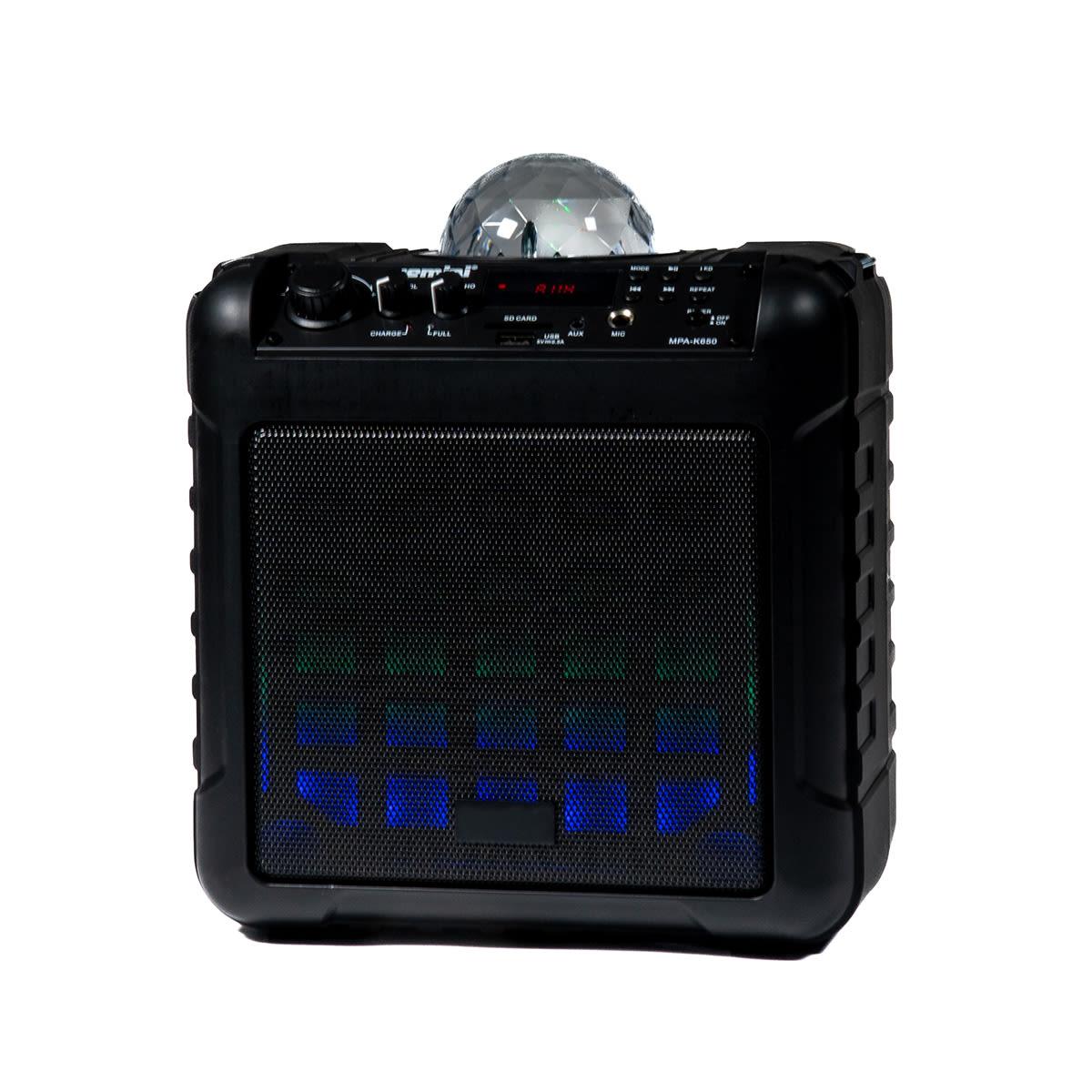 150W peak power & 6.5'' wooferBluetooth, USB, SD playbackLED & Disco Dome lightsIncludes microphone & remotePortable with a shoulder strap Portable Karaoke Party Speaker with LED Lights