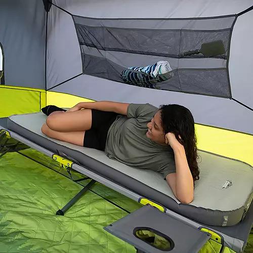 DESIGN & DETAILS: FULL-BODY SUPPORT: Designed with 3” of plush, self-inflating foam and a smooth, mattress-like sleep surface 4-SEASON CAMPING: With an R-value of 8.4 and optimized for temperatures as low as 0°F, the specialized foam and fabric layers work together to ensure you stay warm and cozy DURABLE CONSTRUCTION: Made with a soft-touch 30D Polyester stretch fabric top that feels soft against the skin and a durable 75D Polyester bottom layer CUSTOMIZED COMFORT: Utilizing our EZFlow® system and the included pump sack, effortlessly inflate the sleeping pad in a few minutes CONNECTABLE DESIGN: Our expandable self-inflating camp bed comes with corner straps that enable you to connect multiple beds to create a larger sleep surface HASSLE-FREE PACKING: With a dedicated deflate valve and an oversized carry bag included, packing up is quick and effortless