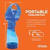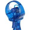 Deluxe Misting Fan that provides up to 1,000-mist sprays. Secure screw on bottom cap allows you to easily add ice. Powerful and safe flexible fan blades provide a cooling breeze. Requires 2-AA batteries (not included). Color: Blue.