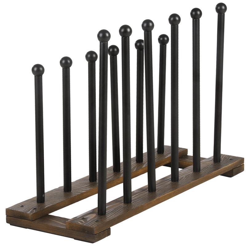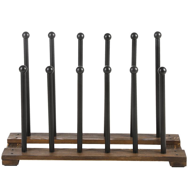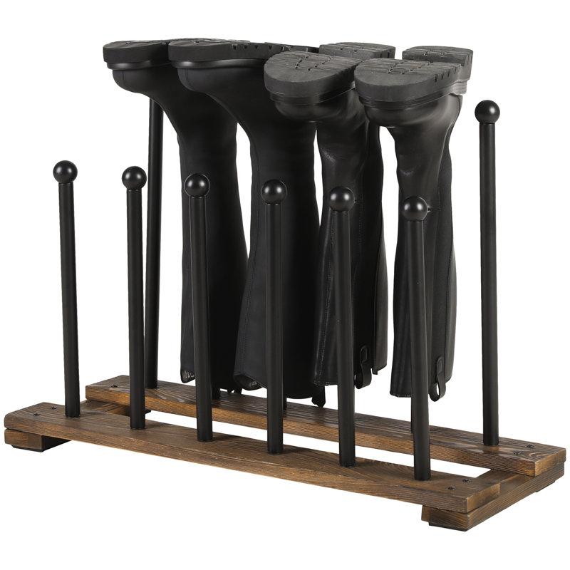 Stylishly organize your boots in your home entryway with this industrial pipe and rustic wood boot holder rack stand. Ideal boot organization, this stand features shorter front posts for mid-calf boots such as rain, snow, cold weather, cowboy, and moto boots with shafts up to 13 inches in length, and taller rear posts for slouch, riding, knee-high boots, and waders with shafts up to 16.5 inches length. This tidy storage solution holds up to 6 pairs of boots in a protective inverted position, keeping them straight to prevent wrinkles and separate to protect leathers. Boots are stored in an inverted upright position to prevent creasing, encourage quick air drying, and keep the boots neatly arranged.