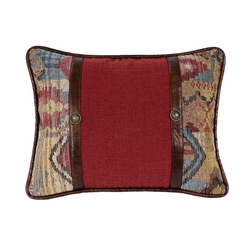 Inspired by traditional Southwestern fabrics, this pillow features a classic red center, surrounded by a visual feast of bold Aztec patterns and bright colors. Brass conchos adorn the faux leather trims that divide the contrasting panels, inspiring a Western vibe. For the finishing touches, the edges are lined with faux leather piping for a refined look. Complete an elegant and colorful Southwestern bedroom when you coordinate with our Ruidoso Comforter Set and other pillows and shams in the collection.