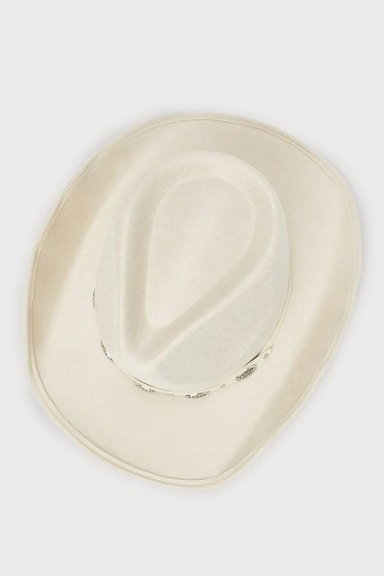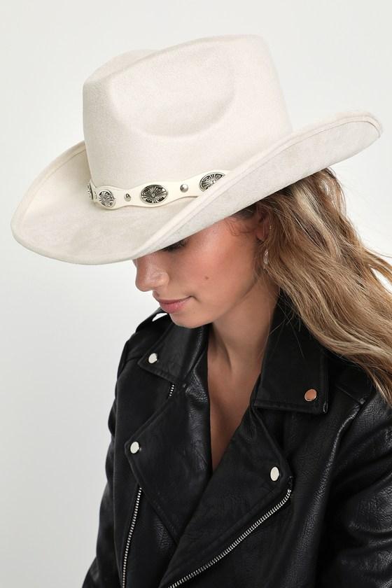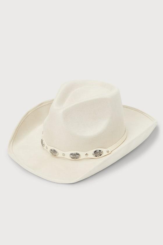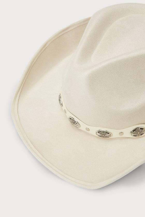 The Lulus Rodeo Cutie Ivory Suede Cowboy Hat doesn't just have us feeling excited, we're practically giddy (up)! Faux suede shapes this festival-ready cowboy hat that has a cute bent brim and a fedora silhouette with a teardrop-shaped crown. A tonal faux leather band features silver conch embellishments that wraps around the base of the crown for a classic finish.