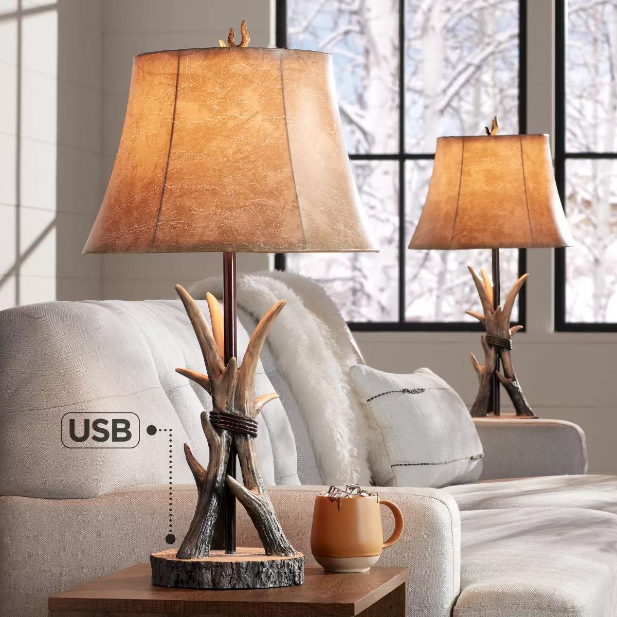 An intriguing USB table lamp design that comes in a convenient set of two. From John Timberland, these rustic table lamps are molded to resemble deer antler horns set on top of slices of wood log. Plug smartphones and other handheld devices into the USB port located on the base for easy charging. Perfect for a lodge cabin or old-fashioned Western style setting.