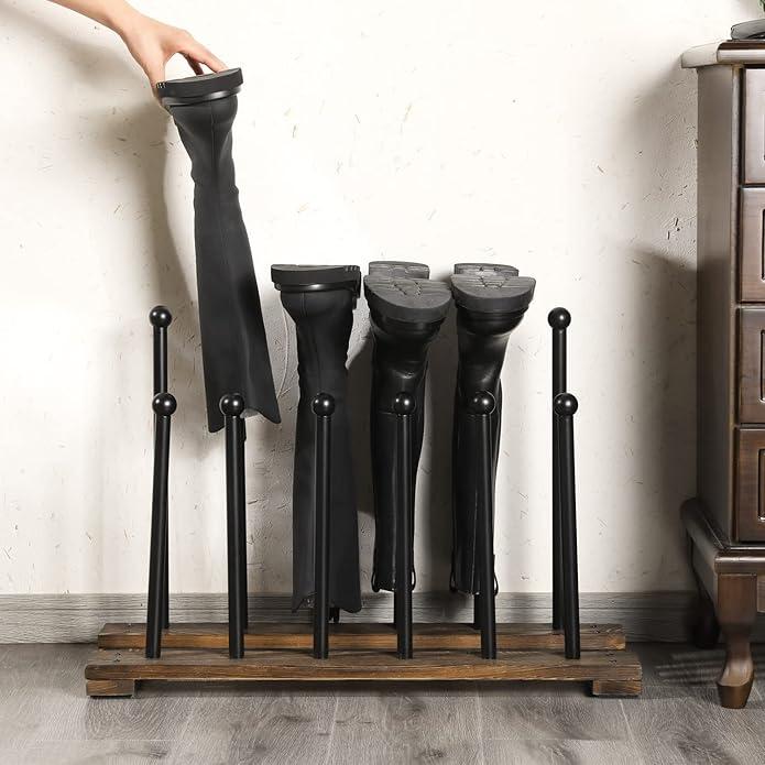 MyGift Modern Entryway Black Metal Boots and Shoe Rack with Rustic Burnt Solid Wood Base, Freestanding Tall Cowboy Boots Work Boot Organizer, Holds 6 Pairs