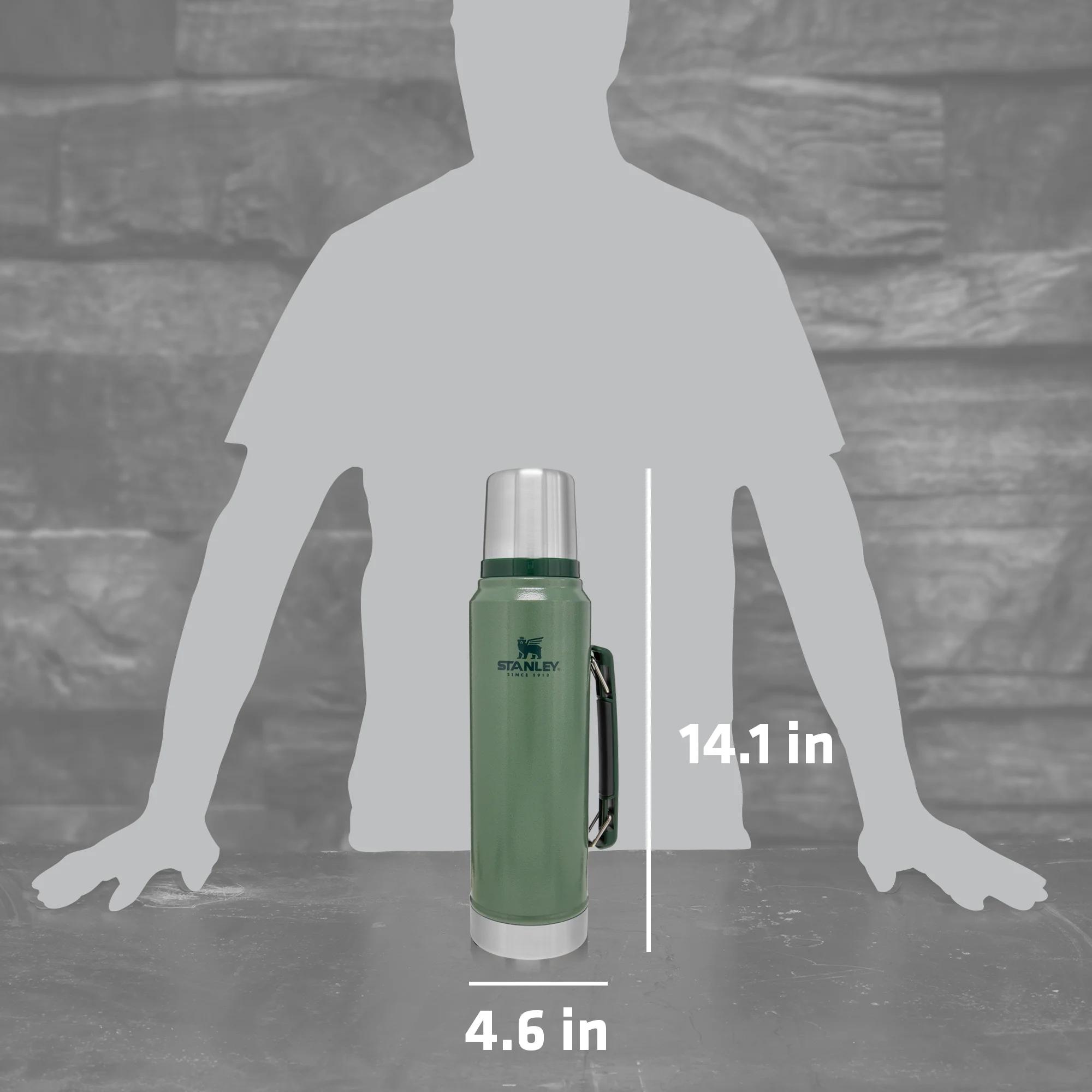 Get unbeatable value, legendary dependability, and the iconic looks of a Stanley Classic Stainless Steel Vacuum Insulated Thermos Bottle, 1.1 qt. For over a hundred years, Stanley bottles have been an indispensable traveling companion for hard-working men and women. The tried-and-true double vacuum insulation keeps your drinks either hot or cold for up to 28 hours. A large 35 oz (1.1 QT) capacity ensures it won’t run out of juice before you do. Made with durable and rust-proof 18/8 stainless steel that can handle the rigors of your toughest days. A simple yet jam-proof stopper pours smoothly & prevents leaks. Topped with a lid that doubles as a convenient drinking cup. A powder-coated hammertone green finish adds durability, better grip, and our signature look. Backed by a lifetime warranty, the Stanley Classic 1.1 QT Vacuum Insulated Bottle is built for your life.