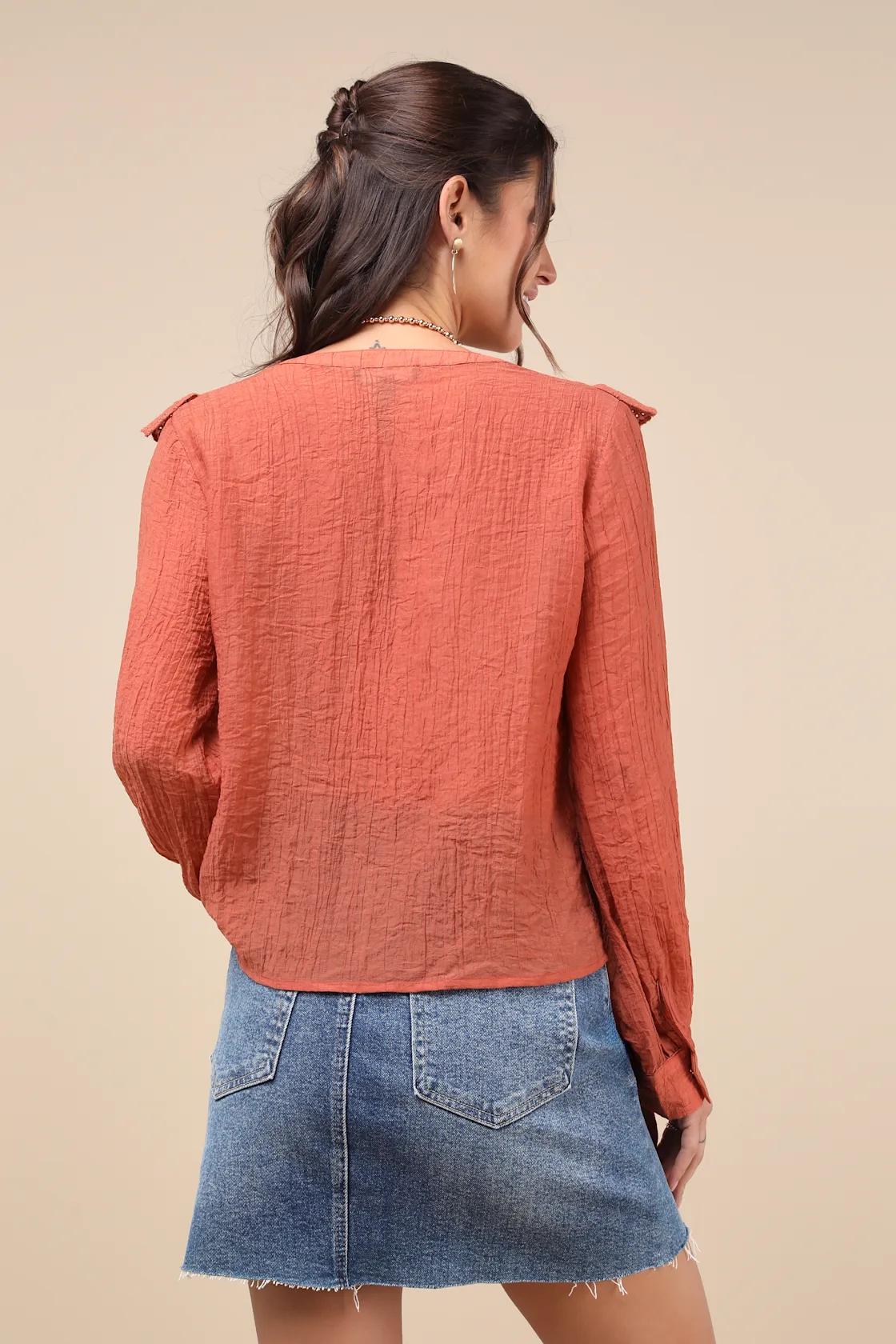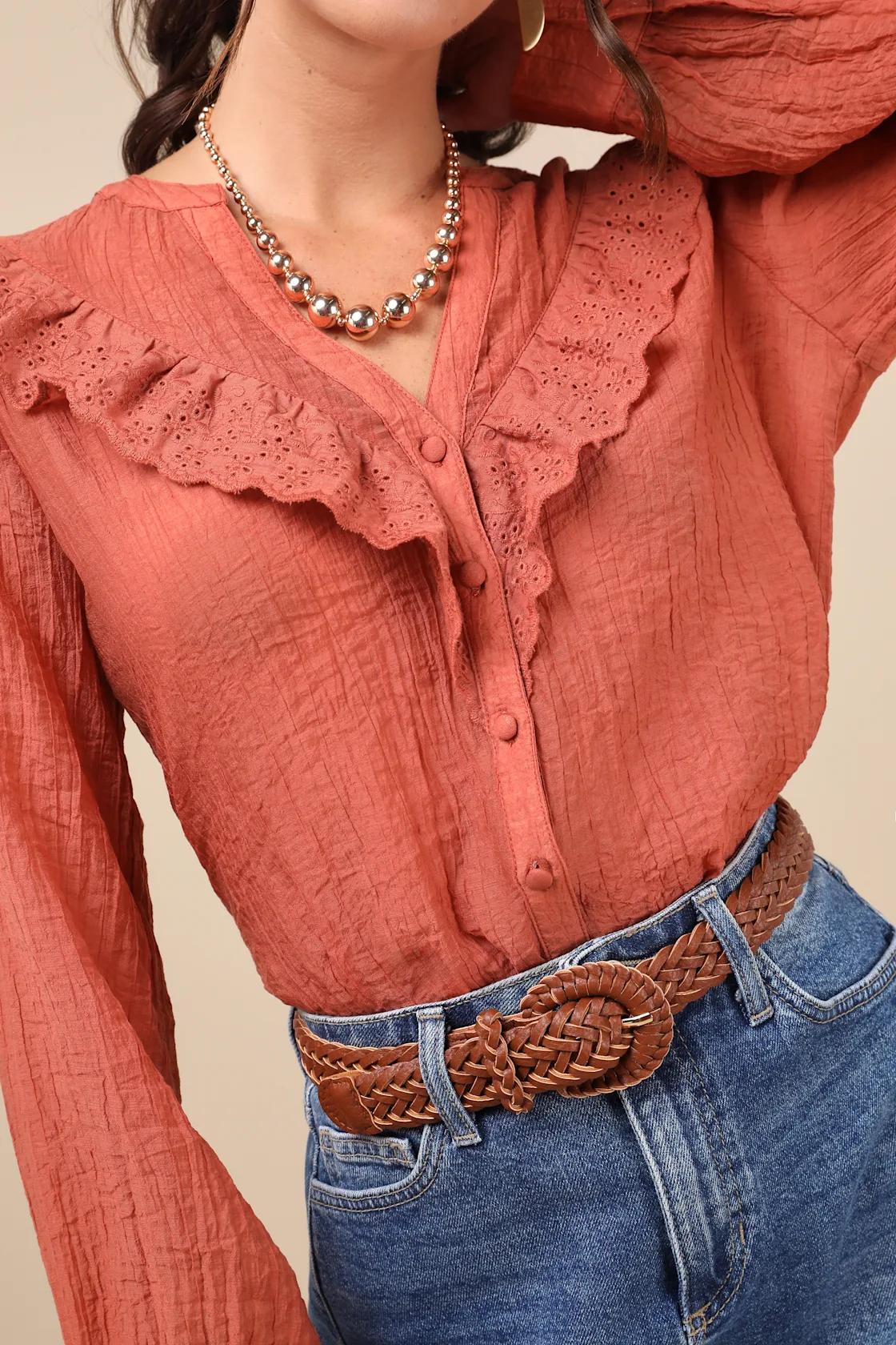 Summer dressing just got easier, thanks to the Lulus Instantly Sweet Terracotta Eyelet Long Sleeve Button-Up Top! Sheer, lightweight woven chiffon (with a crinkled texture) shapes long balloon sleeves with button cuffs. Relaxed bodice has a V-neckline, accented by a band of eyelet-embroidered ruffled trim. Functional button placket secures at the front to complete the look.