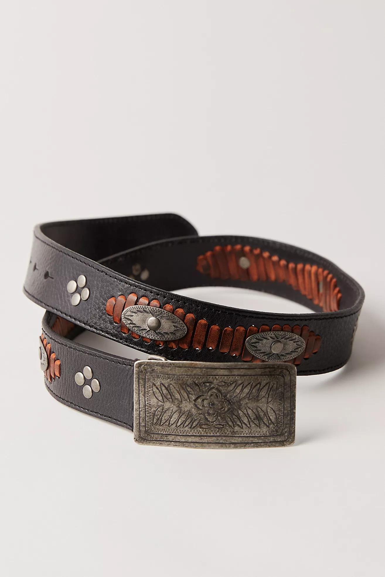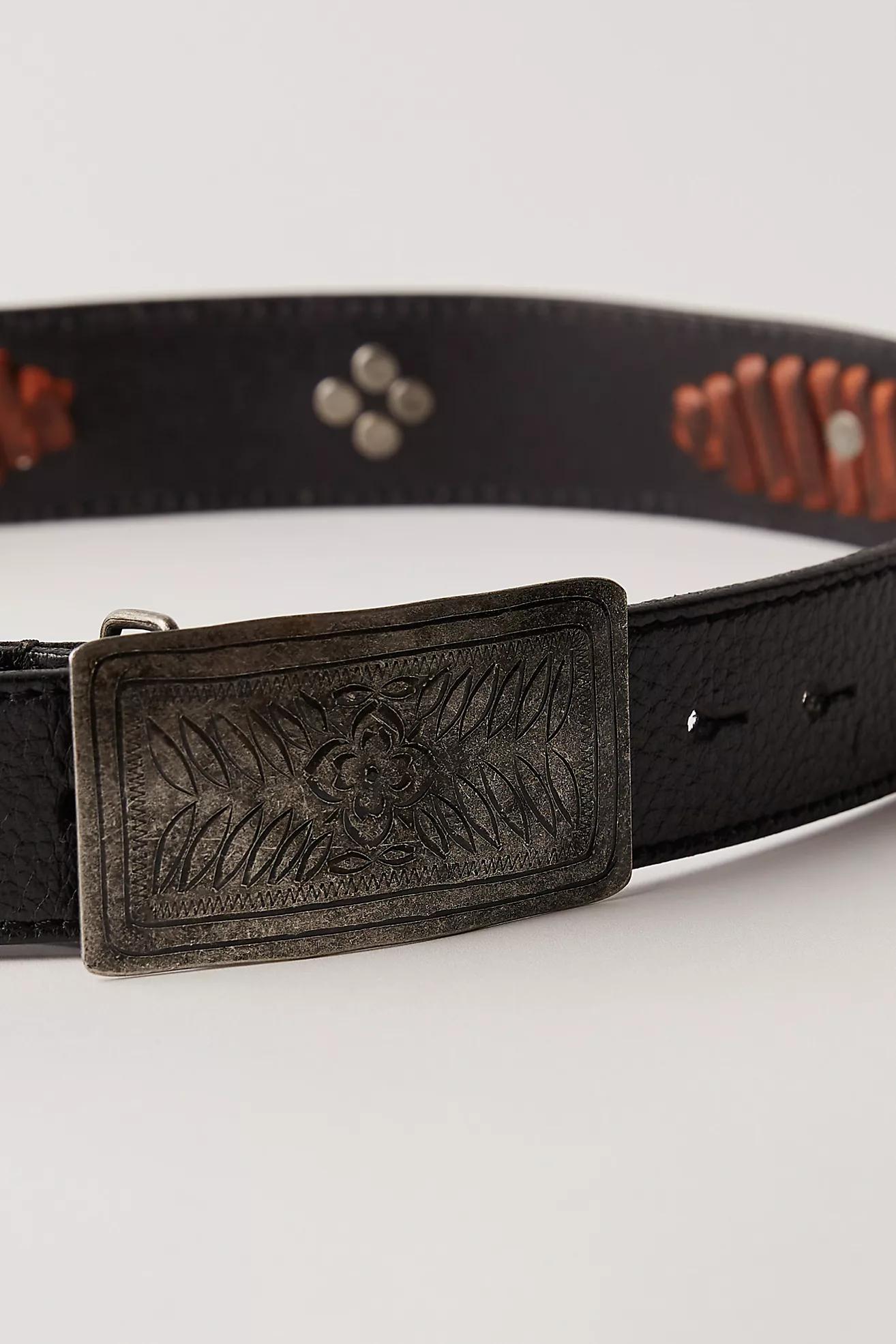 Designed to add a versatile, vintage-inspired touch to absolutely any look, this so cool belt is featured in a luxe leather fabrication with defined embellishments throughout and worn metal buckle for a true lived-in look.