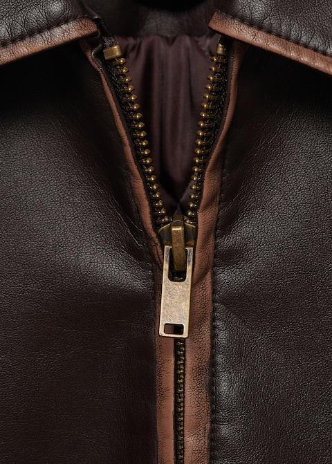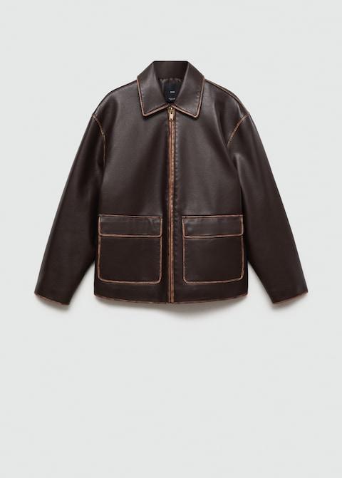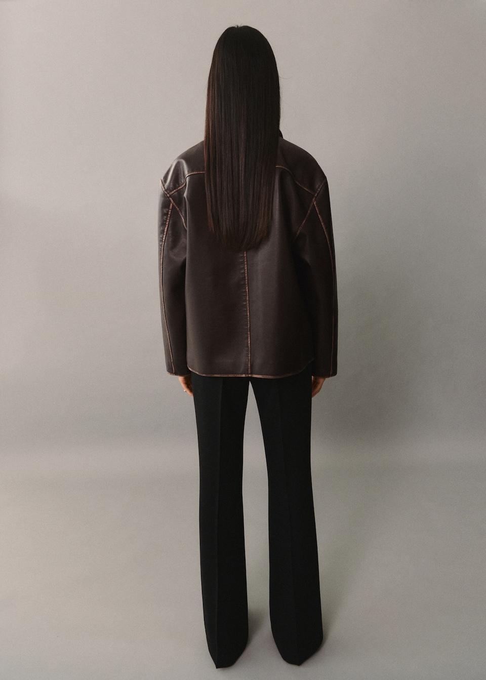 Faux leather. Straight design. Oversize design. Shirt-style collar. Long sleeve. Two patch pockets on the front. Front zipper closure. Inner lining. The model is 1.77 tall and is wearing a size 36.