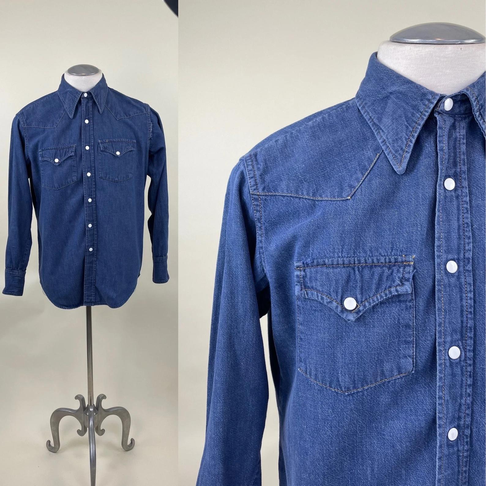 Vintage 1970s Roebucks Western Wear Denim Jean Shirt / 70s Snap Button Cowboy Work Shirt