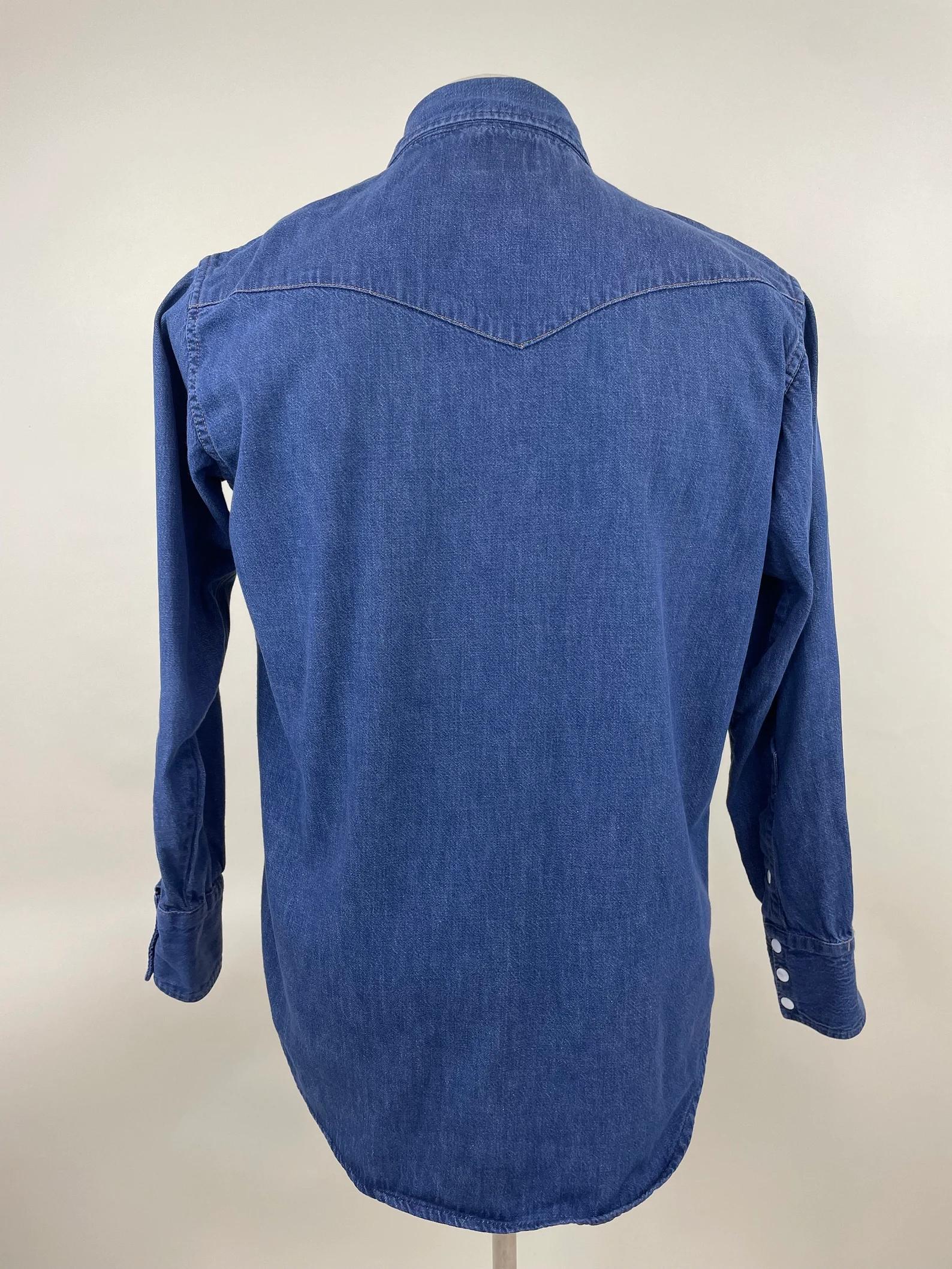 Vintage Genuine Roebucks Western Wear denim jean shirt. Western style cut, metal snap button closures, two chest pockets and curved hem.
