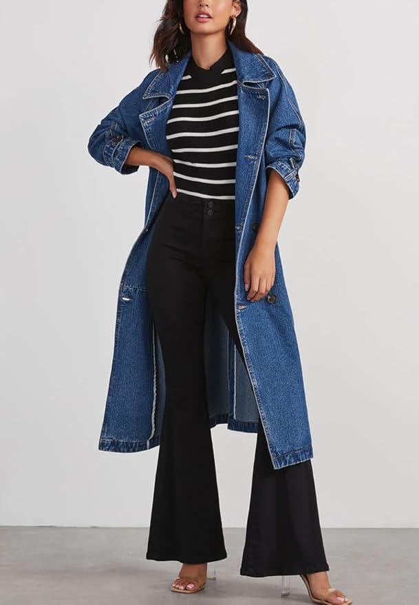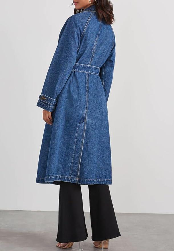 chouyatou Women's Vintage Midi Long Jean Jacket Loose Fit Double Breasted Denim Jacket Trench Coat with Belt