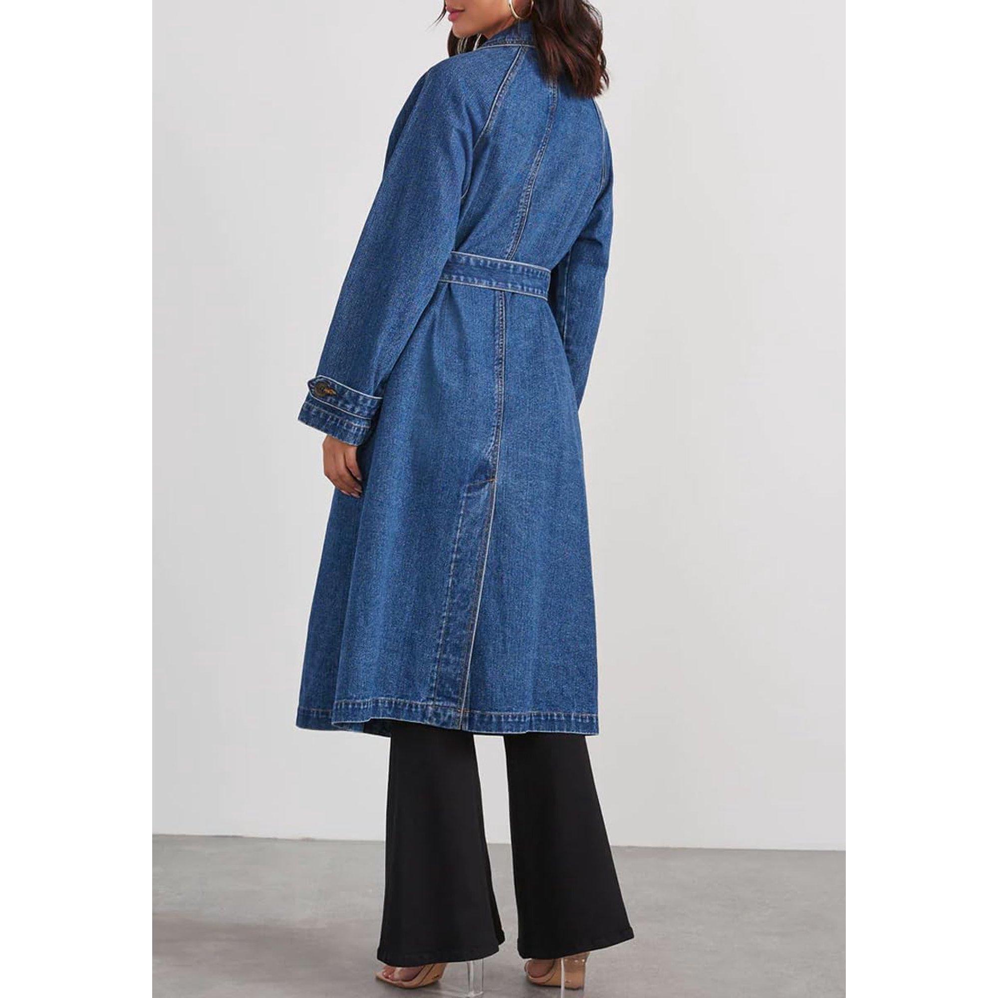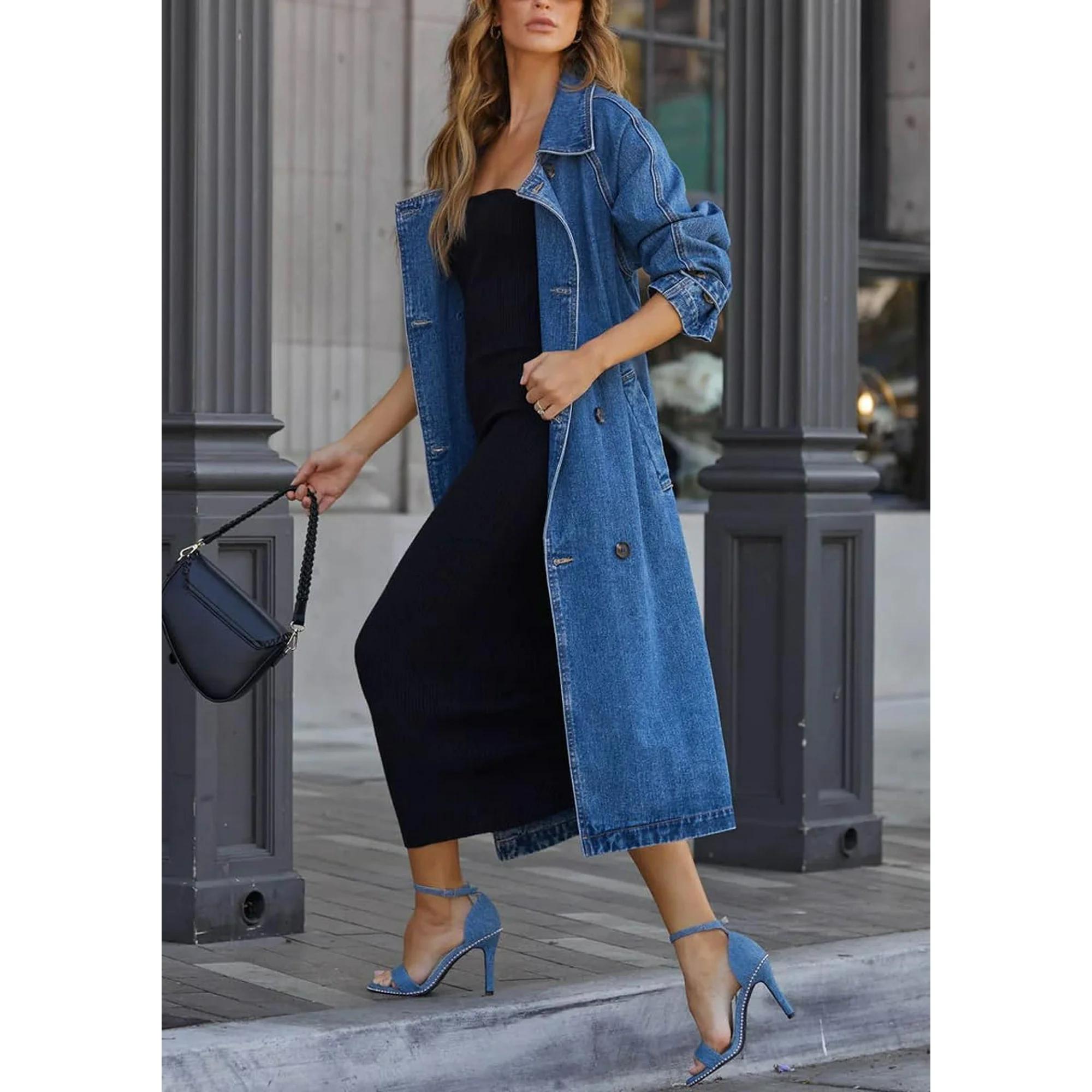 PuliPuqi Women's Vintage Midi Long Jean Jacket Loose Fit Double Breasted Denim Jacket Trench Coat with Belt