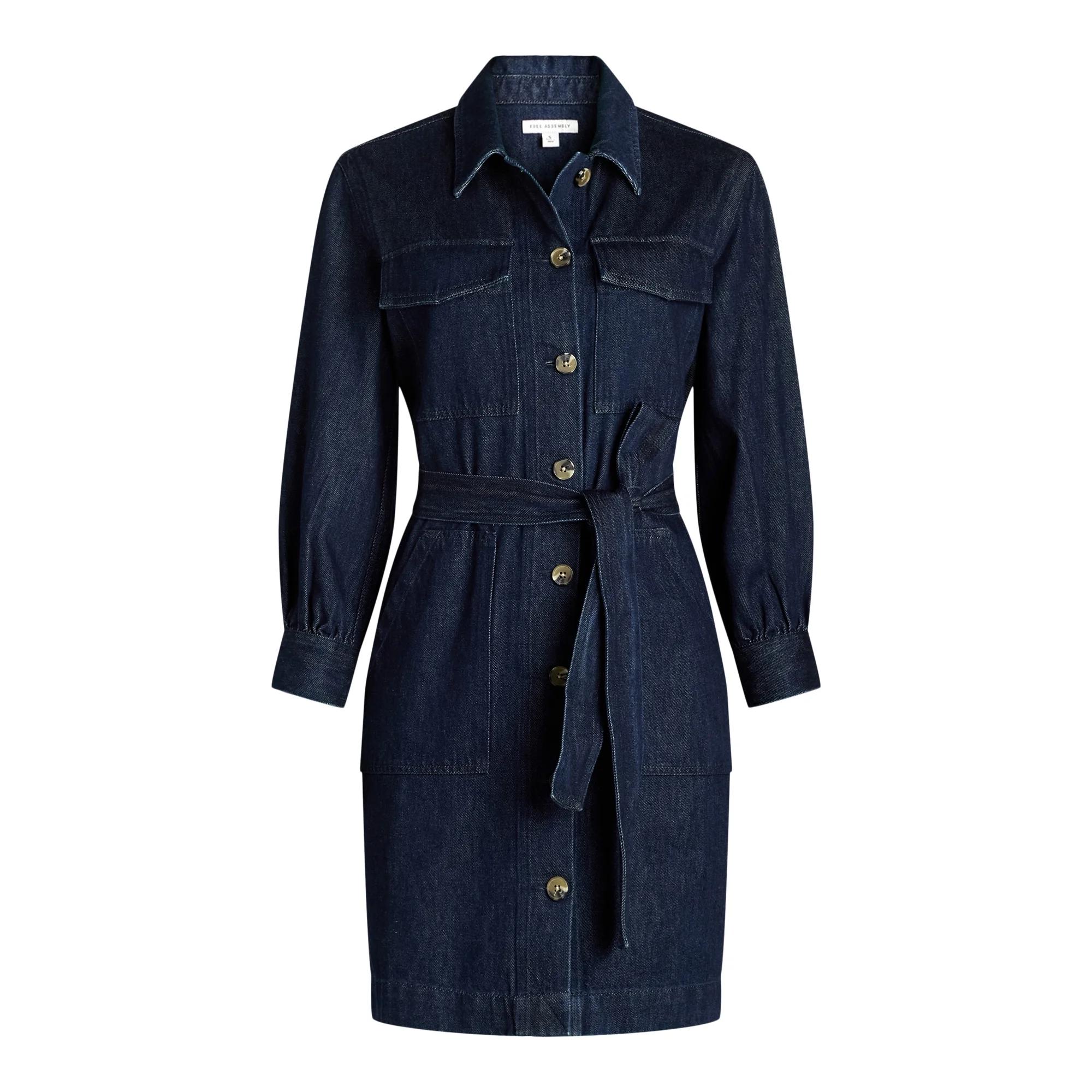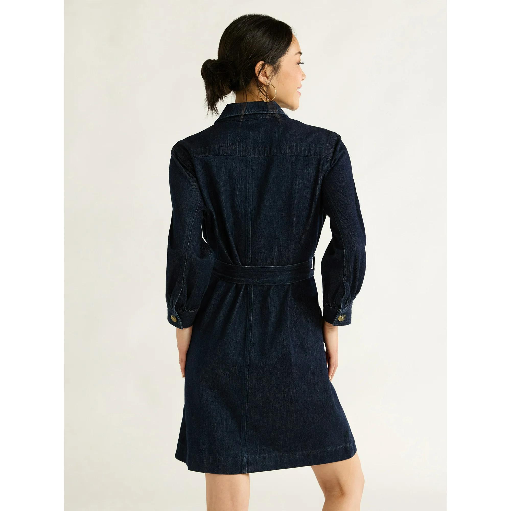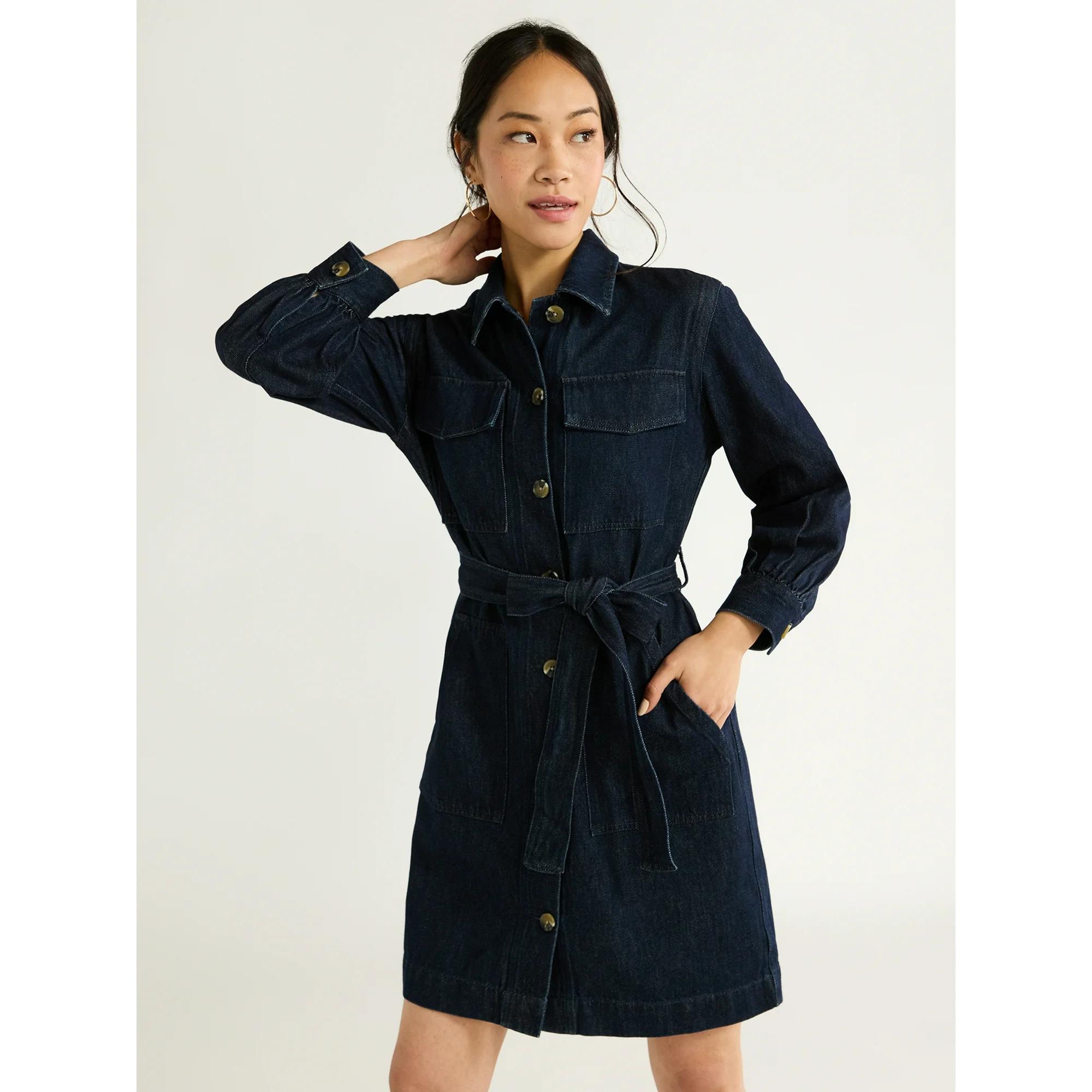 Free Assembly Women's Belted Denim Utility Mini Dress with Long Sleeves, Sizes XS-XXL