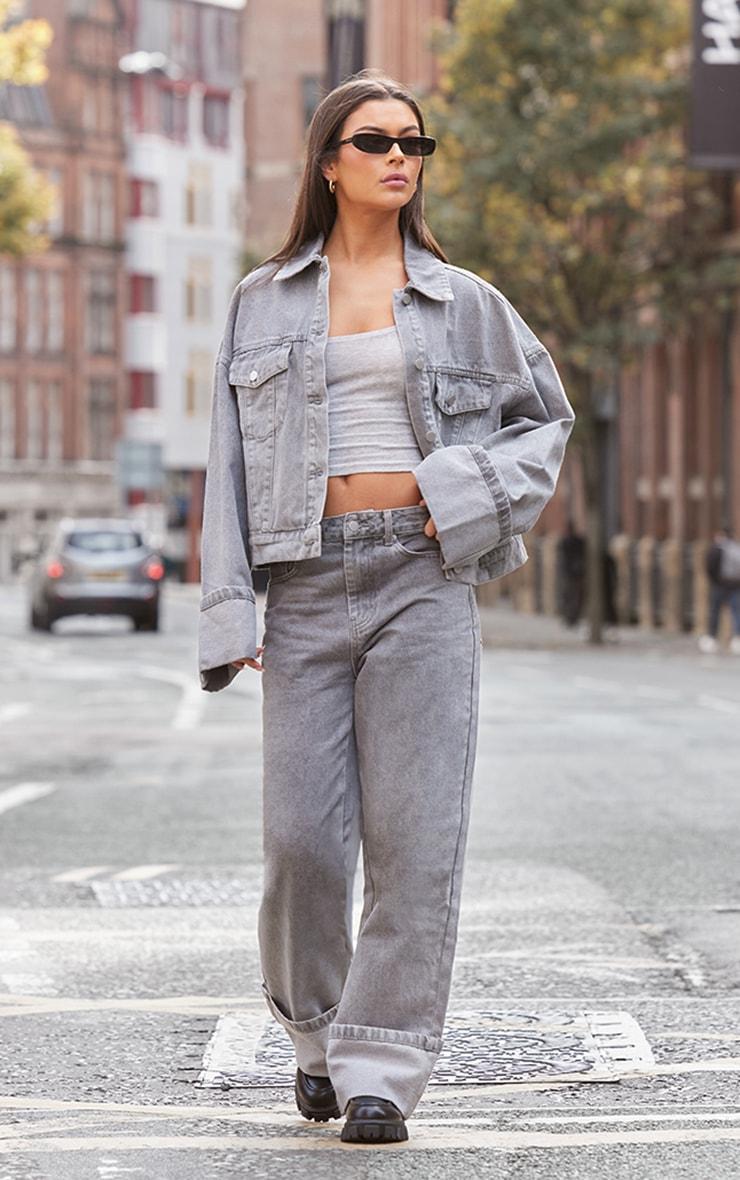 These light grey wash turn up hem wide leg jeans are all the newness you need in your collection. Brought to you in a neutral light grey shade, with an edgy wash hue and turn up hem design, what's not to love? Team with the matching jacket and pair of shades for the ultimate chic finish.