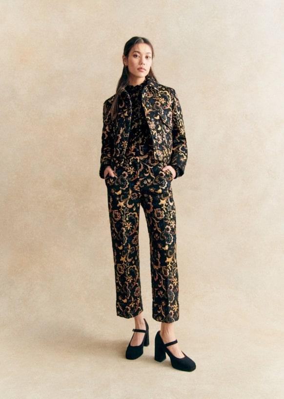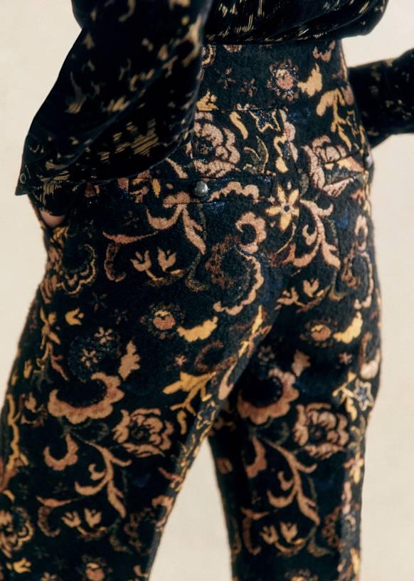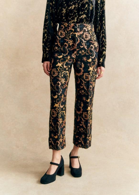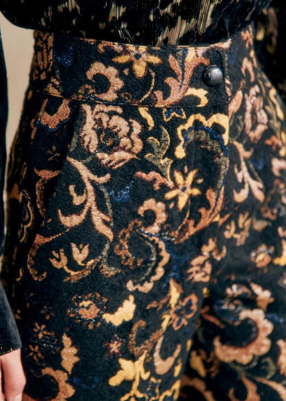 Ankle-length jacquard trousers. Thick material. Turn-up hems. Slant pockets and faux welt pockets with button on back. Defined front and back pleats. Zip and button fastening. Lined. Inside leg length: 69 cm / 27.2 in (size EU36/UK8)