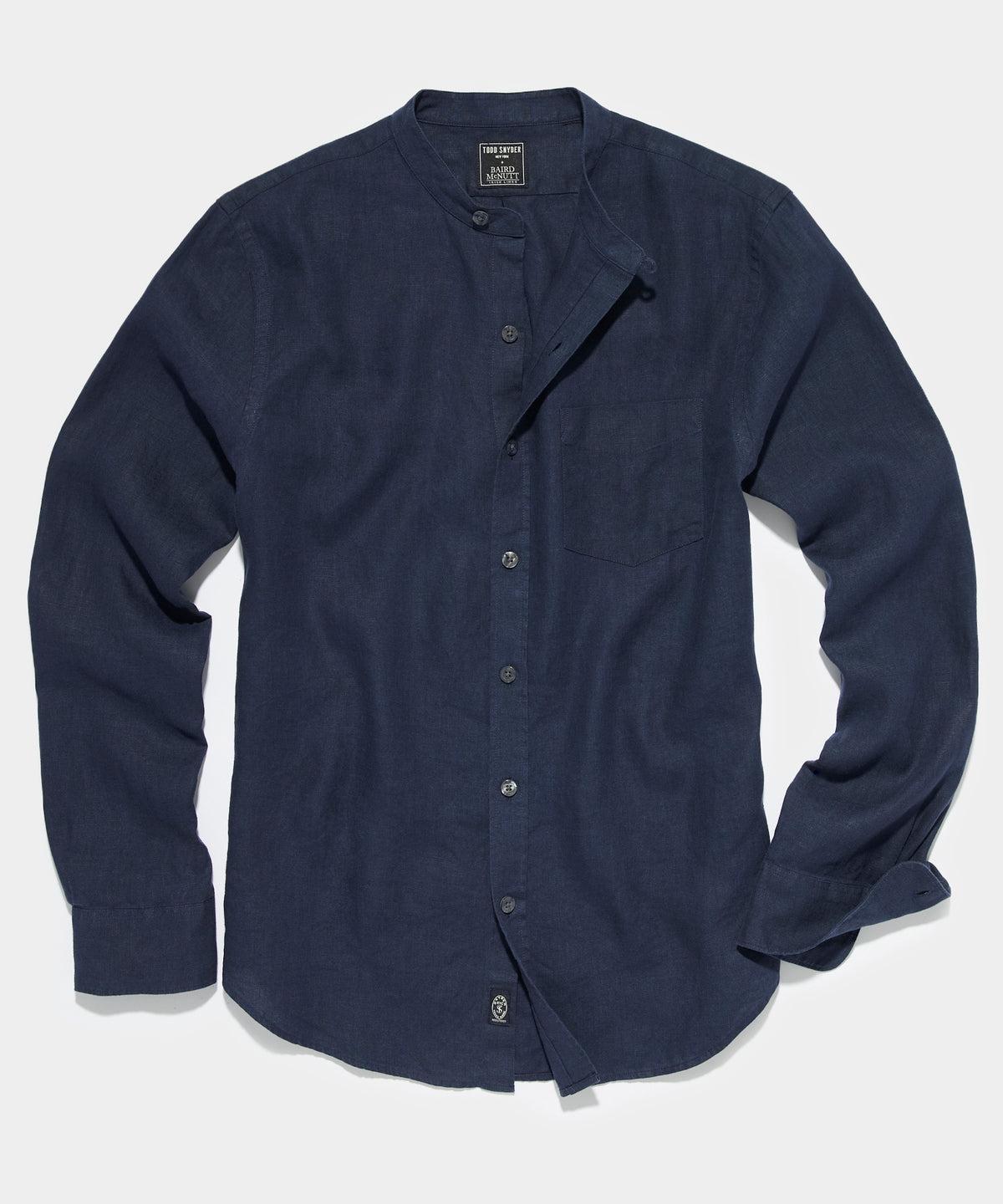 Slim Fit Sea Soft Irish Linen Band Collar Shirt in Navy