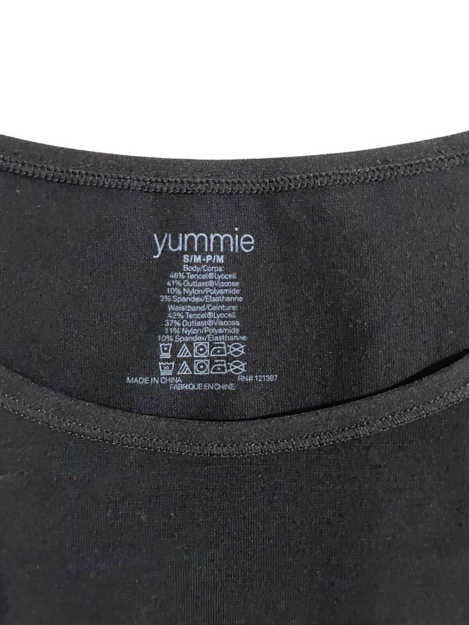 Pair this number with your favorite high-waisted jeans.Introducing the Yummie Women's Scoop Neck Thong Bodysuit, a luxurious addition to your basics. This black bodysuit features long sleeves crafted with fantastically soft fabric, ensuring both comfort and warmth. Made from a blend of 46% Tencel, 41% Outlast Polyester, 10% Nylon, and 3.5% Spandex, it contours naturally to your body. With a scoop neckline and convenient snap closure at the crotch, this solid pattern thong bodysuit offers a perfect fit with a length of 24.5" and sleeve length of 24".