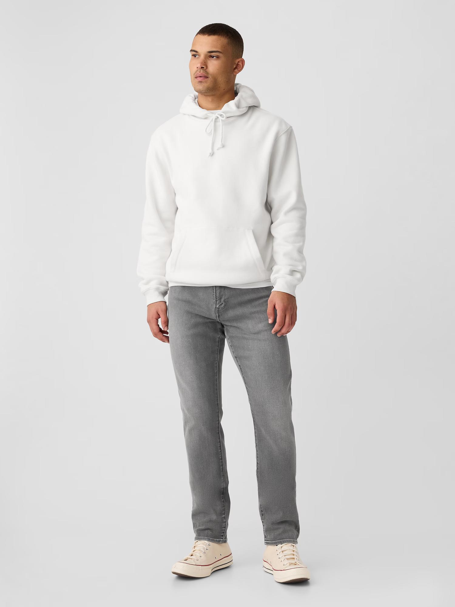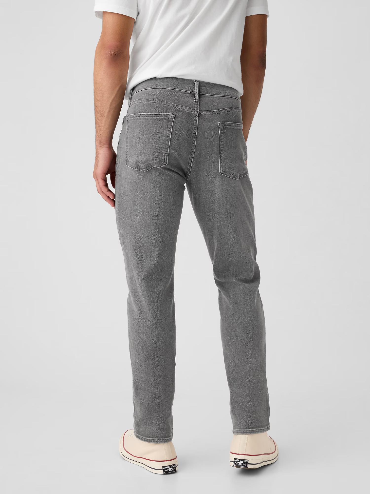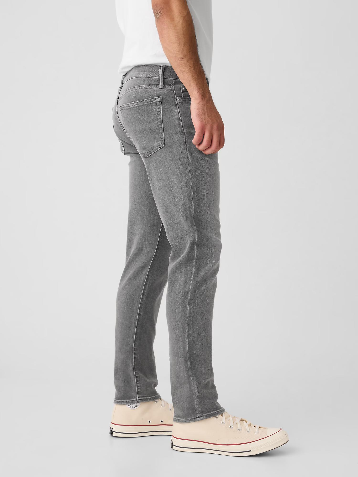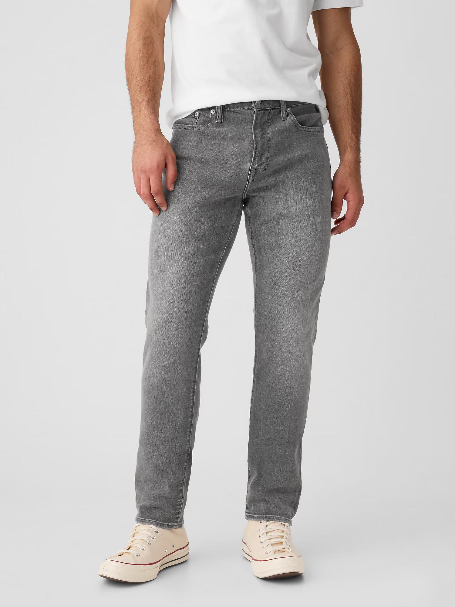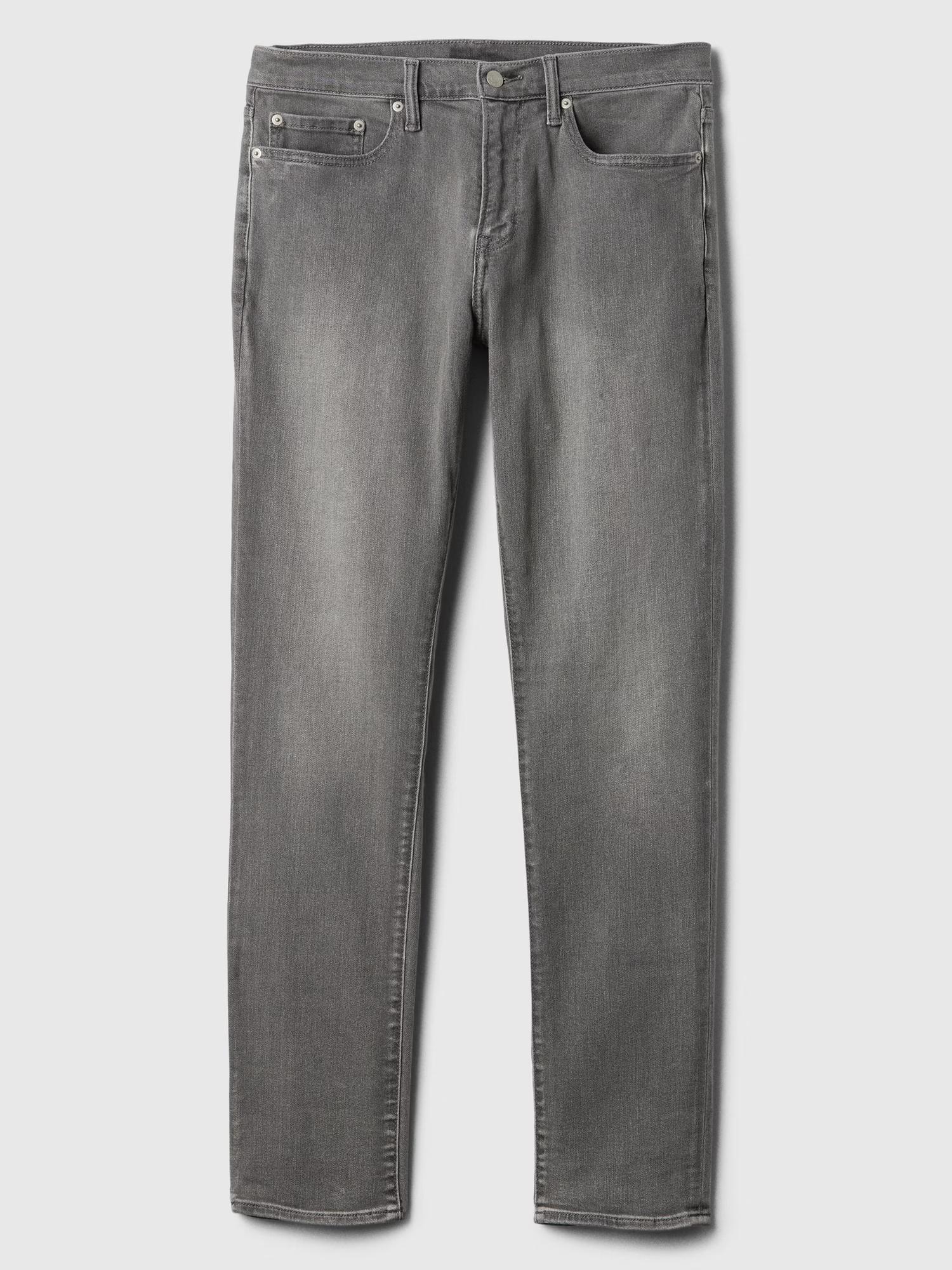 Made with 5% recycled contents. Better denim. Better planet. This pair of denim is part of our water-saving Washwell program. Compared to conventional wash methods, Washwell has saved millions of liters of water since 2016. Made with GapFlex stretch technology for extra flexibility and total comfort. Soft wear denim. Gray wash with fading. Button closure, zip fly. Classic five-pocket styling. Sits at the waist. Slim through the hip and thigh. Slim through the leg.