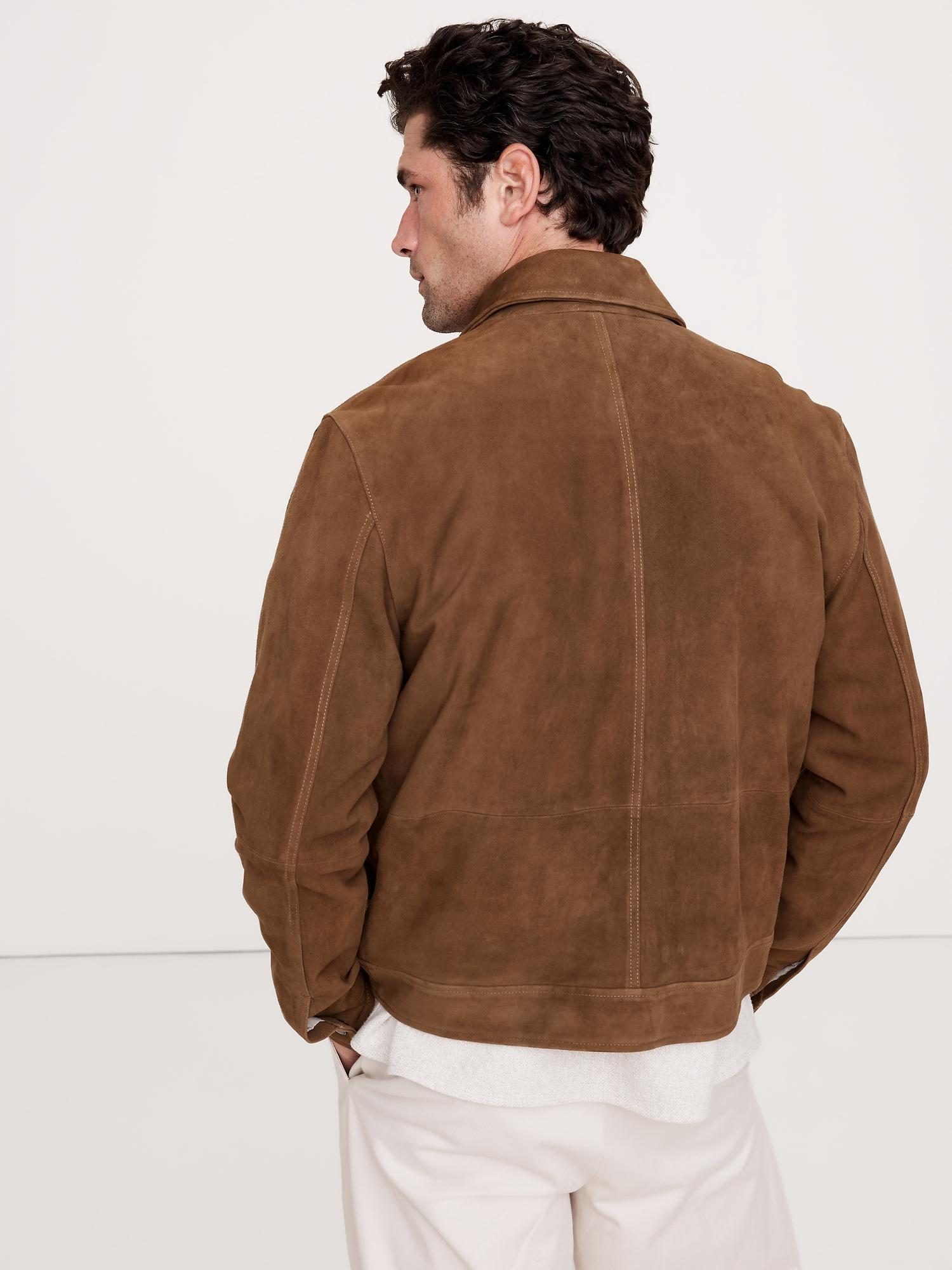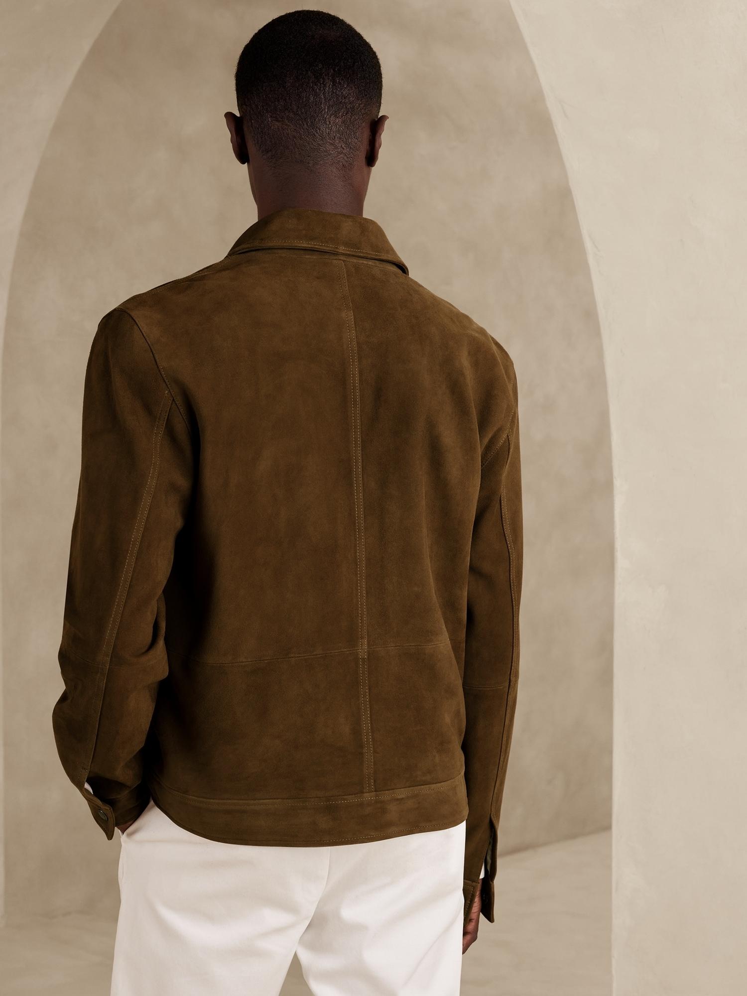 A luxurious take on a utilitarian staple, this suede jacket borrows its silhouette from classic trucker jean jackets. We kept the pocketing, snap buttons, and top-stitch detailing of the original, and rendered it in premium suede, made in one of the world’s most renowned ateliers. Plus, since it's suede, it will only get better with time, developing a rich and unique patina. Standard Fit: Classic. A straight & easy fit. Spread collar with snap closure. Chest pockets with snap closure. Side pockets. Two interior pockets. Side pockets. Two interior pockets. Fully lined. Standard Fit: A straight & easy fit. Long sleeves. Hip length. Model: Size M, 6'2"