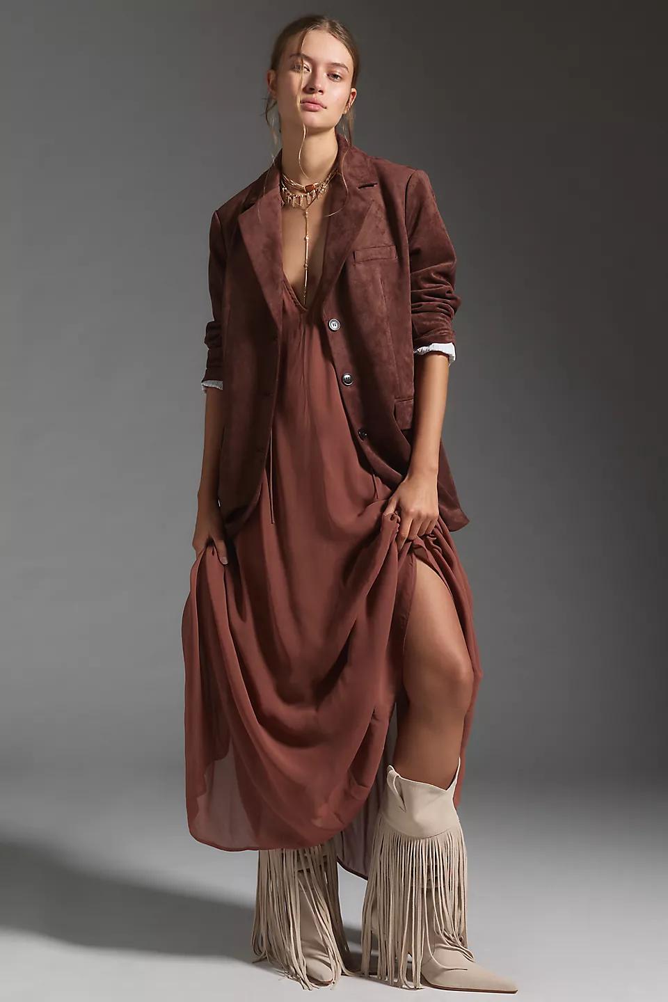 Don't forget a jacket – the season's staple is having a moment. Crafted from faux suede, this boyfriend blazer features a notched lapel collar and just the right pockets. Polyester, elastane Oversized fit Notched lapel collar Chest welt pocket Front flap pockets Button front Dry clean Imported