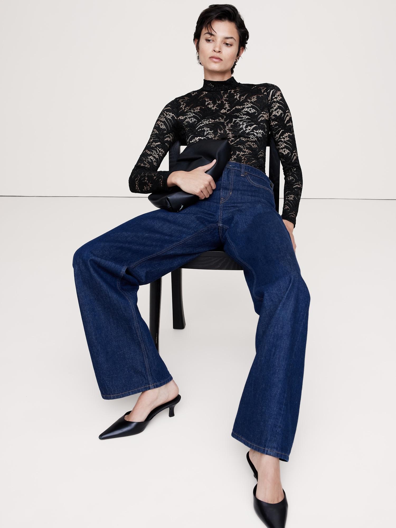 A bodysuit to make dressing-up feel effortless, we cut this one from your choice of stretch-lace or a sparkling jersey-knit fabric. Here, our designers opted for a high, mock neck design and an unlined, semi-sheer bodice—an unexpected combination we love.
