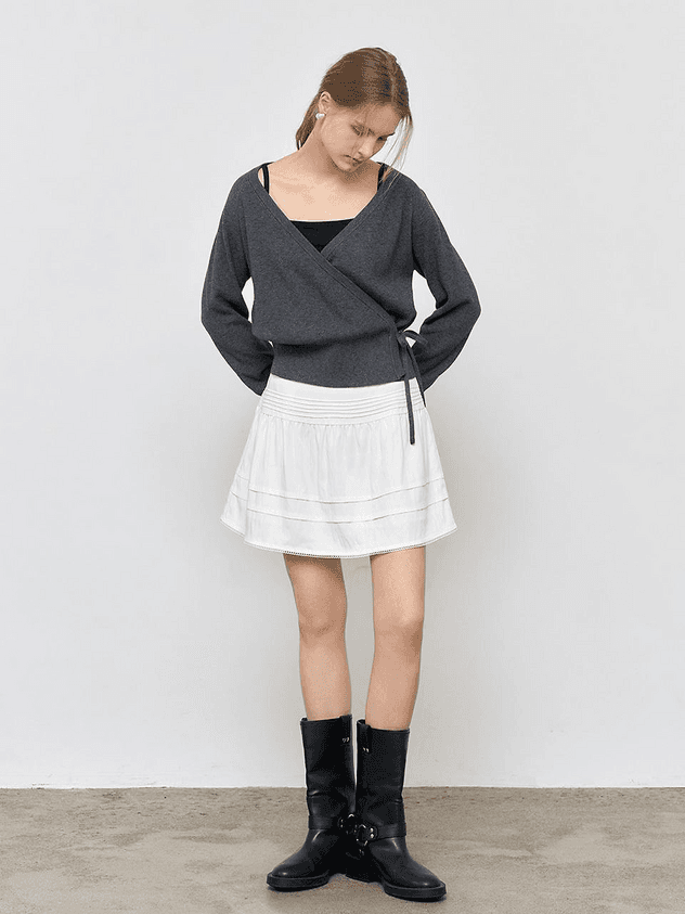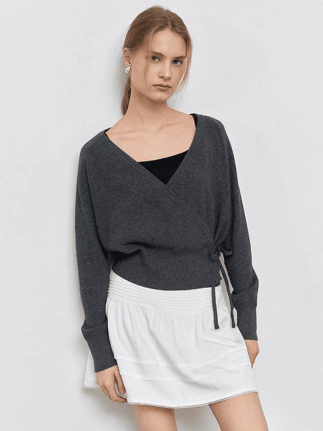 The Hachi Wrap Cardigan offers a feminine silhouette crafted from an anti-pilling blend featuring a durable ribbed knit texture that maintains its shape beautifully. Available in ivory and charcoal, this versatile piece comes with both internal button and external ribbon closures for secure styling options. The standard-fit cardigan runs in sizes S through L (US 2-12), with a recommendation to size up for a relaxed fit, making it an ideal layering piece for spring through winter wear.Color: ivory, charcoal